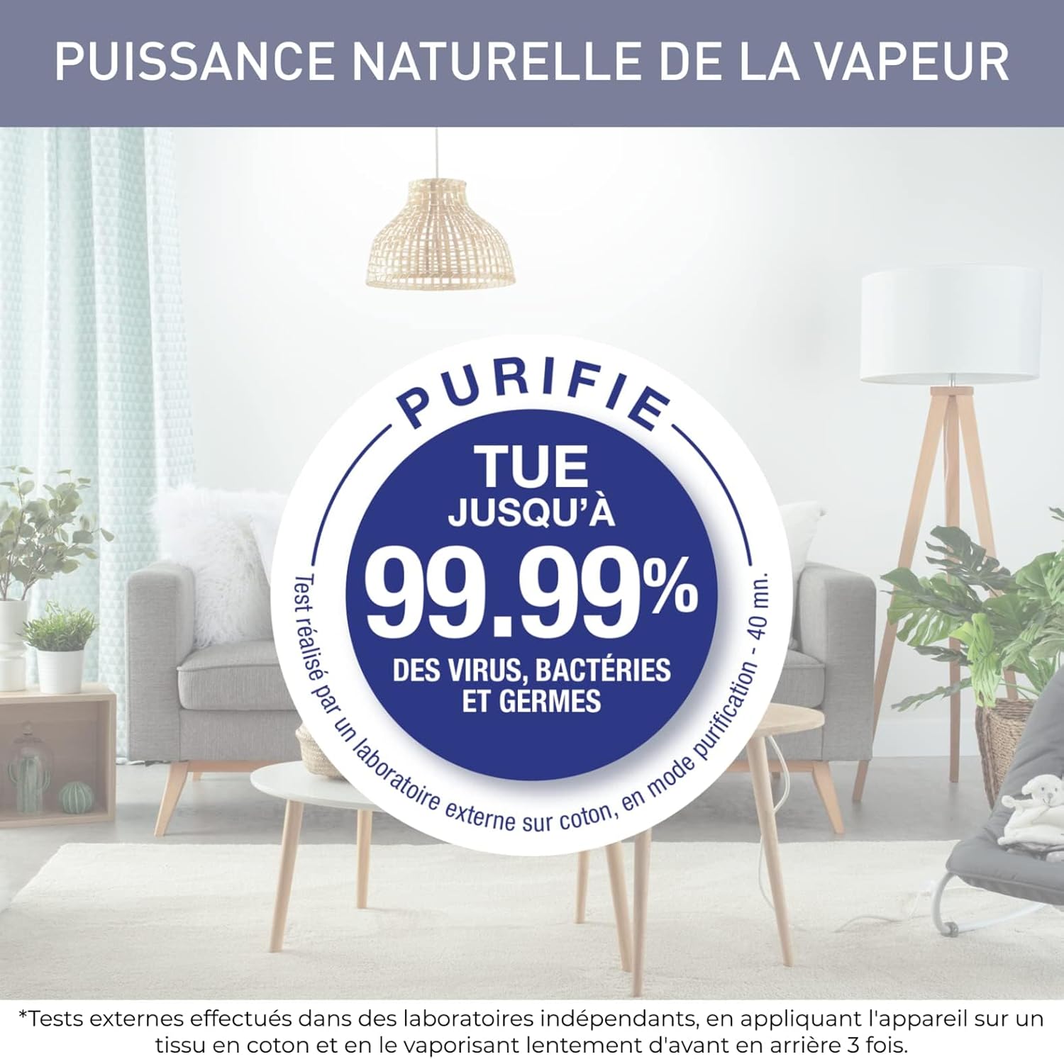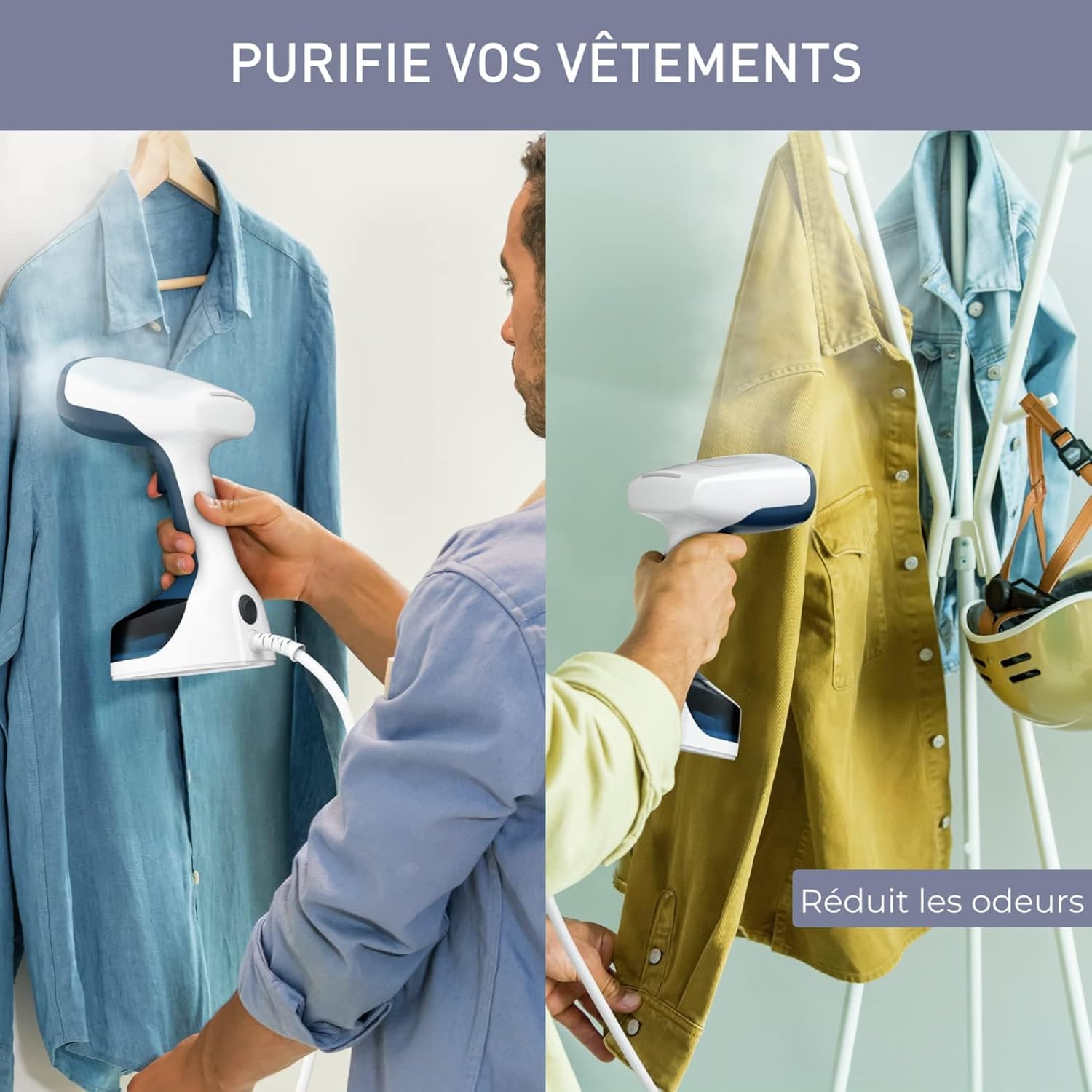 – Il purifie aussi les vêtements : sa vapeur élimine jusqu’à 99,9 % des bactéries et des odeurs. Son réservoir de 150 ml offre environ 8 minutes d’utilisation par remplissage.