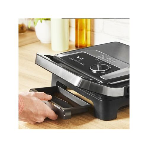 Le Tefal GC272D10 chauffe rapidement pour griller viande, poisson, légumes ou paninis. Son thermostat réglable sur 3 positions permet d’adapter la cuisson selon l’aliment — cuisson douce pour légumes, plus forte pour viandes. Les plaques sont anti-adhésives, ce qui empêche les aliments de coller et facilite le nettoyage. Le bac récupérateur de graisses récolte jus et graisses pour une cuisson plus saine et un entretien facile. Compact, léger et facile à ranger verticalement — pratique même dans une petite cuisine.