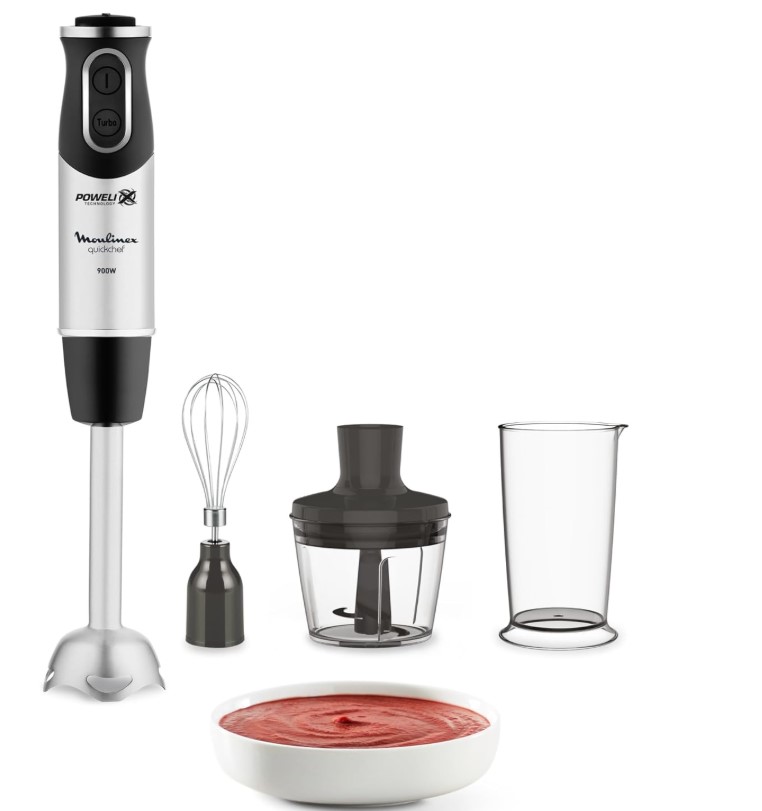 • Accessoires : pied mixeur, mini‑hachoir, fouet, verre doseur